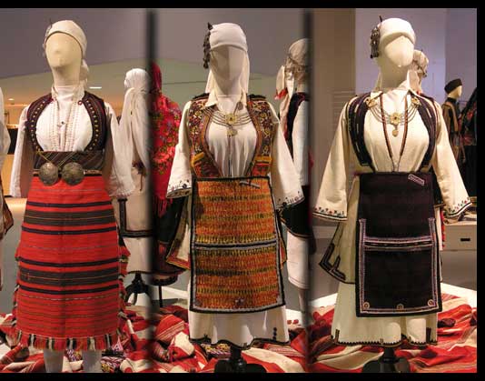 Costume de Kratéro Appartenant à Mme Marika Georgopoulos-Caron (Marseille) Costume d' Aghia Paraskévi Appartenant à Mr Jean-Alex BENETTO (Marseille) Costume d' Niki Appartenant à Mr Jean-Alex BENETTO (Marseille) Cest dans la partie nord de la région de Florina, sur un plateau entouré de montagnes, que se trouvent les douze villages des "basses terres" : lun dentre-eux est Kratero. Cest l' un des endroits les plus pauvres de cette région infertile. Les forêts avoisinantes offraient des ressources tels le bois de construction, le charbon et l'apiculture, mais la population vivait dans la privation et la pauvreté. Un proverbe disait : "même acheter un bouton peut vous priver d'un prochain repas". Les femmes tissaient leur propre tissu de laine et de coton, à partir desquels elles cousaient de simples robes ; celles-ci sont, néanmoins, parmi les plus chic en Grèce. La
